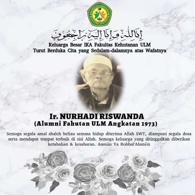 Keluarga besar Ikatan Alumni Fakultas Kehutanan Universitas Lambung Mangkurat (IKA Fahutan ULM) menyampaikan duka cita yang mendalam atas wafatnya Ir. Nurhadi Riswanda, alumni Fakultas Kehutanan ULM angkatan 1973.