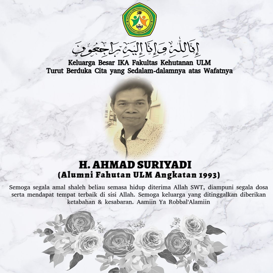 Banjarbaru – Keluarga besar Ikatan Alumni Fakultas Kehutanan Universitas Lambung Mangkurat (IKA Fahutan ULM) menyampaikan duka cita yang mendalam atas wafatnya H. Ahmad Suriyadi, S.Hut, alumni Fakultas Kehutanan ULM angkatan 1993.