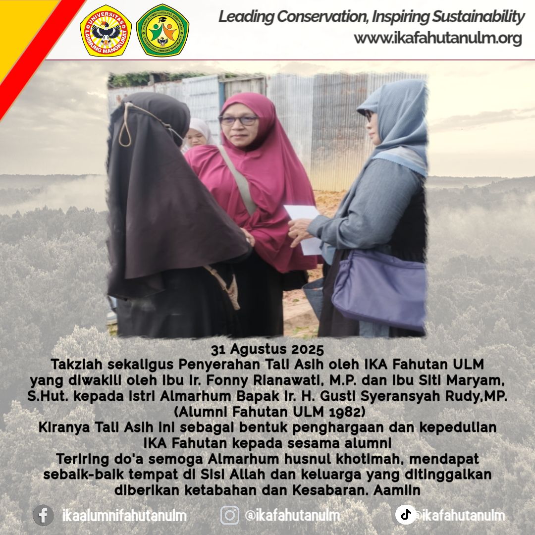 Banjarbaru, 31 Agustus 2025 – Ikatan Alumni Fakultas Kehutanan Universitas Lambung Mangkurat (IKA Fahutan ULM) kembali menunjukkan kepeduliannya terhadap sesama alumni dengan menyerahkan tali asih kepada keluarga almarhum Ir. H. Gusti Syeransyah Rudy, MP. (Alumni Fahutan ULM 1982).
