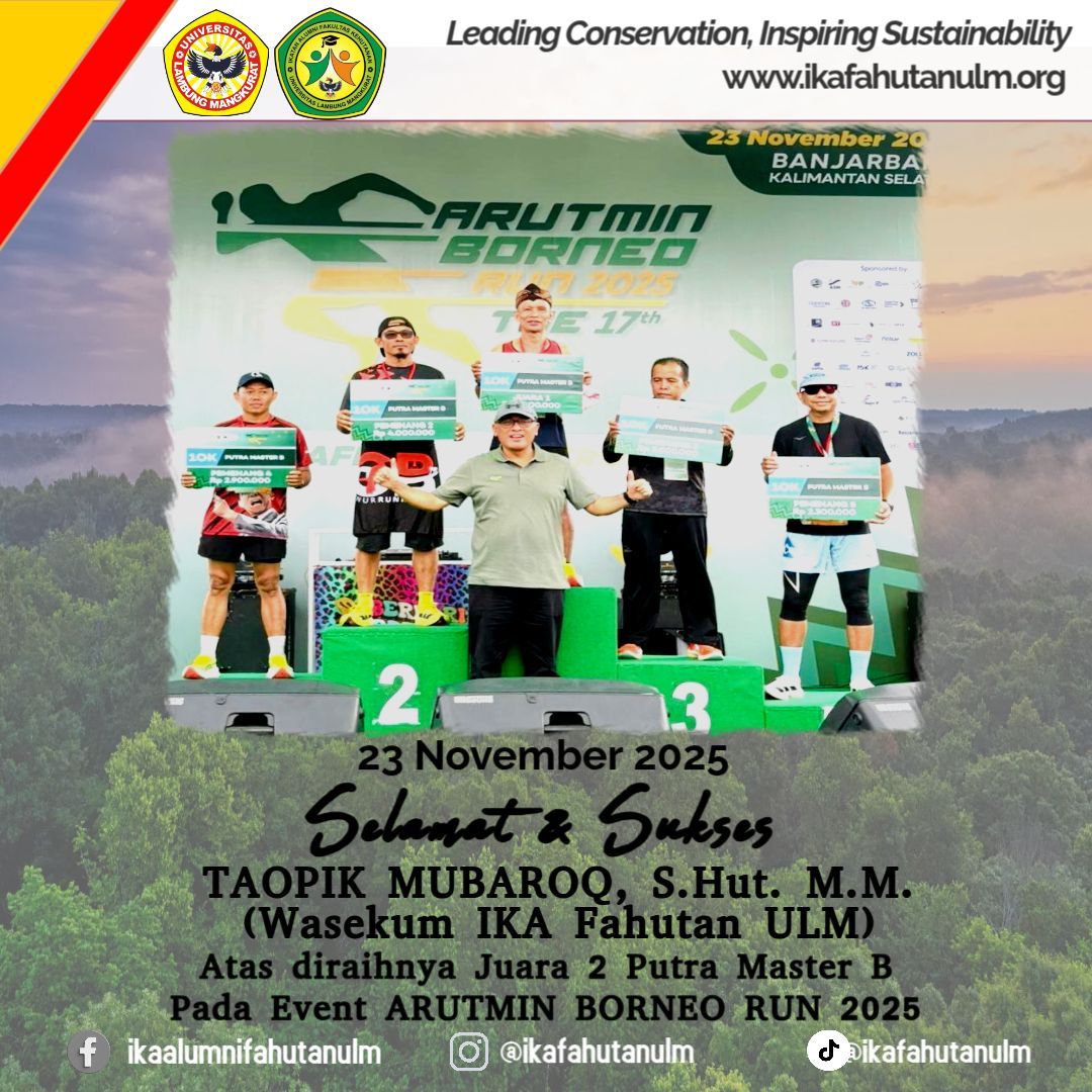 Salah satu peserta yang mencuri perhatian adalah Taopik Mubaroq, S.Hut., M.M., yang juga menjabat sebagai Wakil Sekretaris Umum IKA Fahutan ULM. Ia berhasil meraih Juara 2 kategori Putra Master B, sebuah pencapaian membanggakan di tengah persaingan ketat para pelari master.