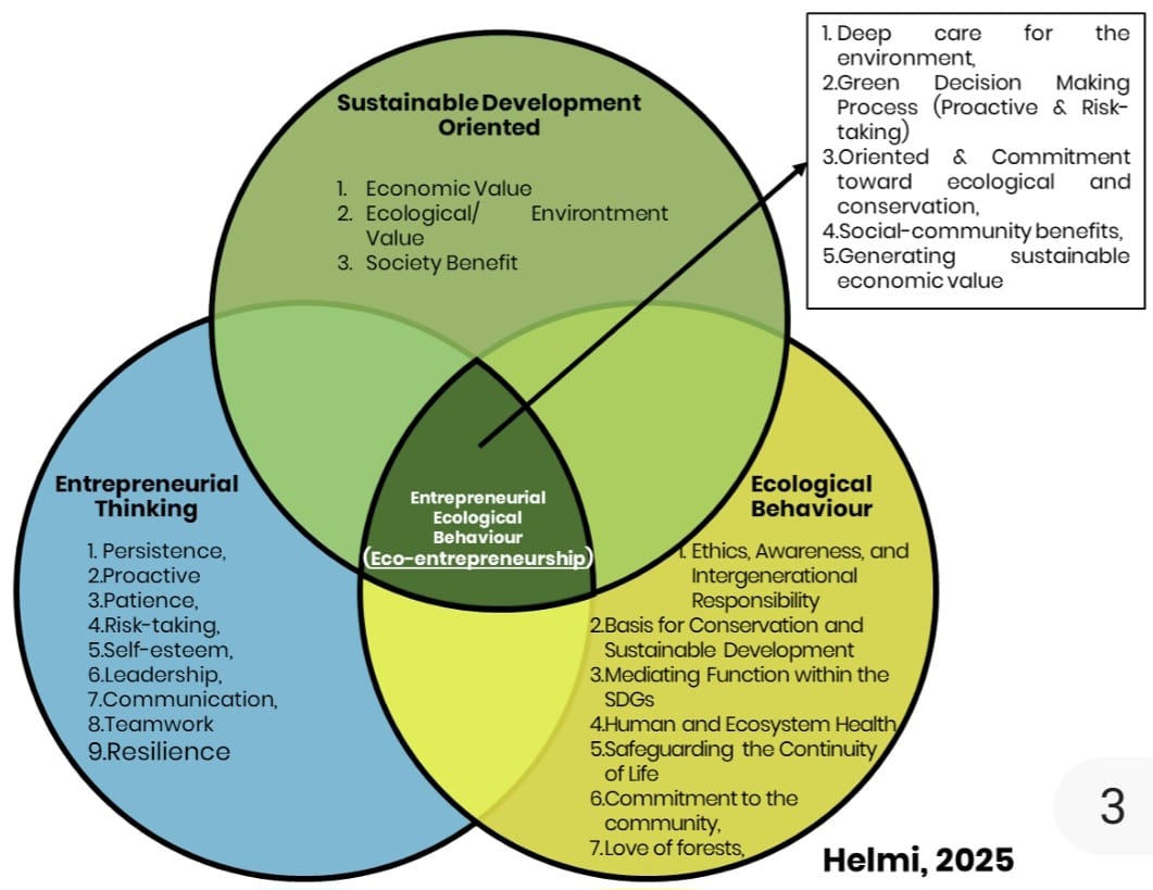 Pada titik pertemuan ketiga domain tersebut muncul konsep Perilaku Ekologis Kewirausahaan (Entrepreneurial Ecological Behaviour – EEB), yaitu praktik hidup dari kewirausahaan hijau yang menghubungkan niat manusia, etika lingkungan, dan inovasi bisnis.