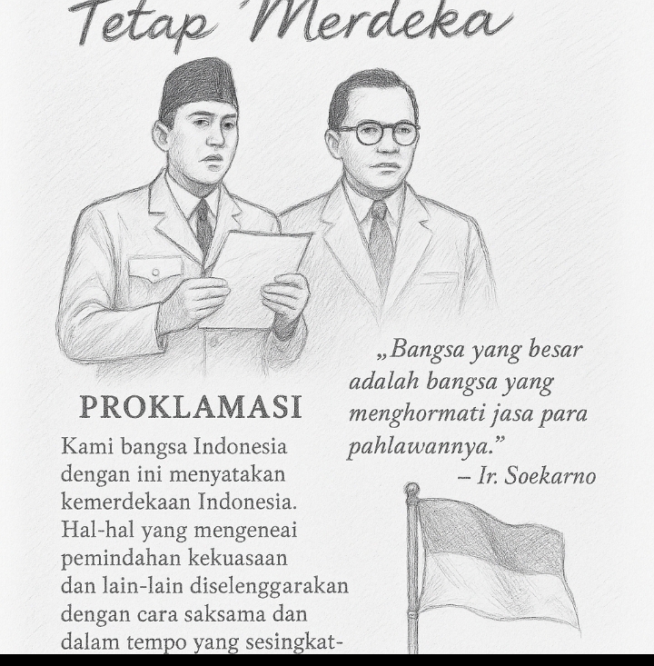 Pada pagi yang hening, di tengah langit Jakarta yang cerah, dua tokoh bangsa berdiri tegar di sebuah rumah sederhana di Jalan Pegangsaan Timur No. 56. Tanpa dentuman meriam, tanpa sorak kemenangan, hanya dengan suara lantang dan penuh keyakinan: