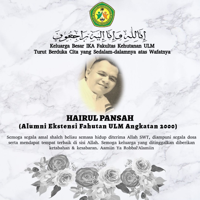 Keluarga besar Ikatan Alumni (IKA) Fakultas Kehutanan Universitas Lambung Mangkurat (ULM) menyampaikan duka cita yang mendalam atas wafatnya salah satu alumni terbaiknya, Hairul Pansah, yang merupakan Alumni Ekstensi Fahutan ULM Angkatan 2000.