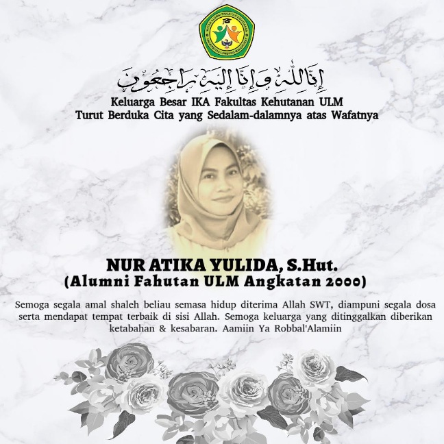 Keluarga Besar IKA Fakultas Kehutanan Universitas Lambung Mangkurat (ULM) menyampaikan duka cita yang sedalam-dalamnya atas wafatnya Nur Atika Yulida, S.Hut., Alumni Fahutan ULM Angkatan 2000.