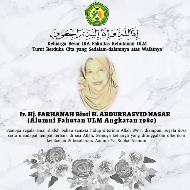 Banjjarbaru– Keluarga Besar IKA Fakultas Kehutanan Universitas Lambung Mangkurat (ULM) menyampaikan duka cita yang mendalam atas wafatnya salah satu alumni terbaiknya, Ir. Hj. Farhanah Binti H. Abdurrasyid Nasar, Alumni Fahutan ULM Angkatan 1980, dalam usia 64 tahun.