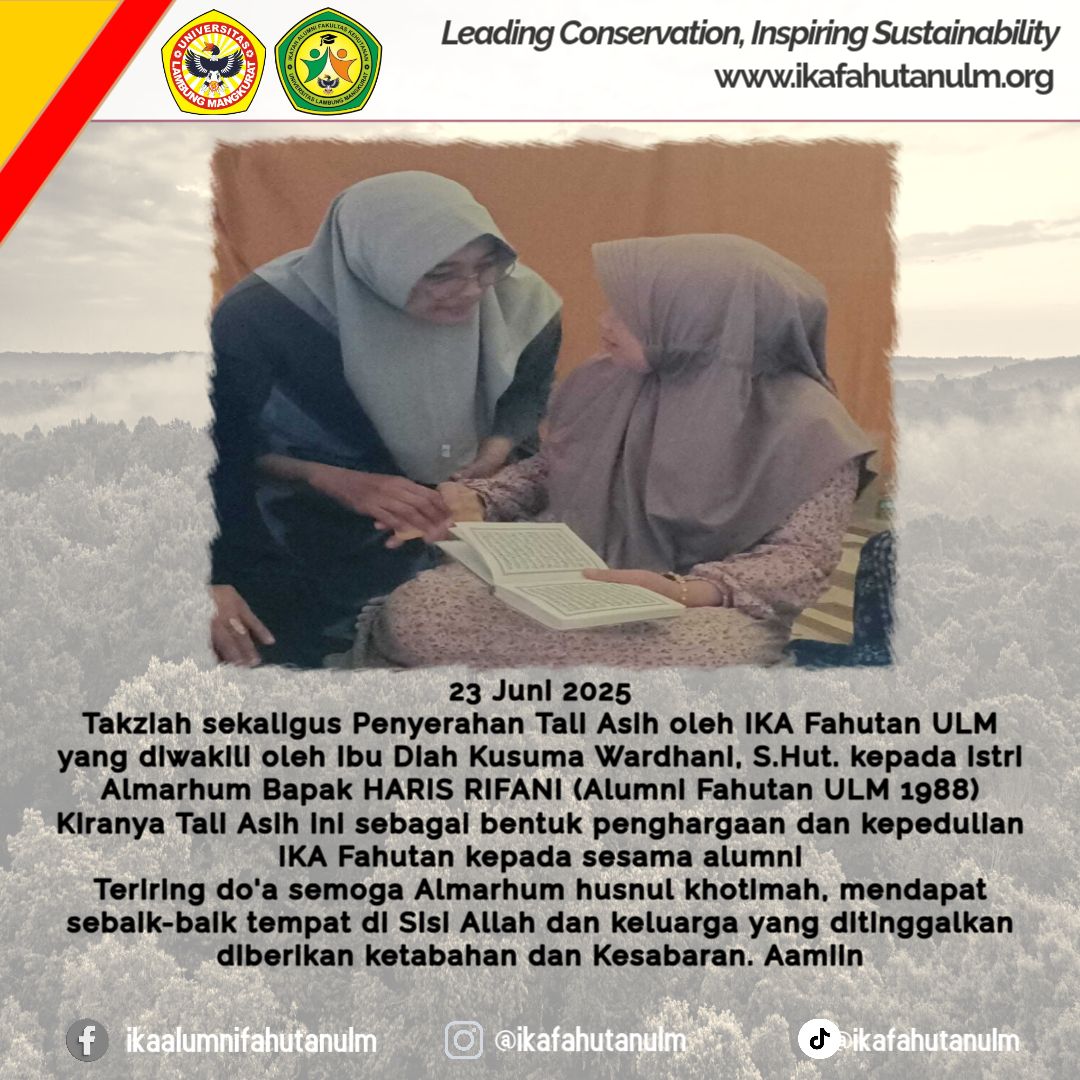 Banjarbaru, 23 Juni 2025 – Sebagai bentuk kepedulian dan penghormatan kepada sesama alumni, Ikatan Alumni Fakultas Kehutanan Universitas Lambung Mangkurat (IKA Fahutan ULM) melaksanakan takziah sekaligus penyerahan tali asih kepada keluarga almarhum Bapak Haris Rifani, alumni angkatan 1988.