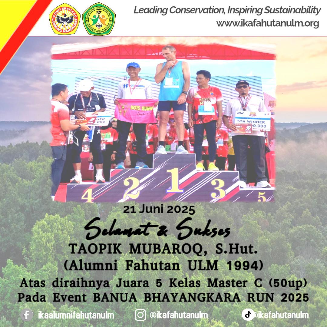 Banjarbaru, 21 Juni 2025 – Keluarga besar Ikatan Alumni Fakultas Kehutanan Universitas Lambung Mangkurat (IKA Fahutan ULM) mengucapkan selamat dan sukses kepada Taopik Mubaroq, S.Hut., alumni angkatan 1994, atas keberhasilannya meraih Juara 5 dalam ajang Banua Bhayangkara Run 2025 pada kategori Master C (usia 50 tahun ke atas).