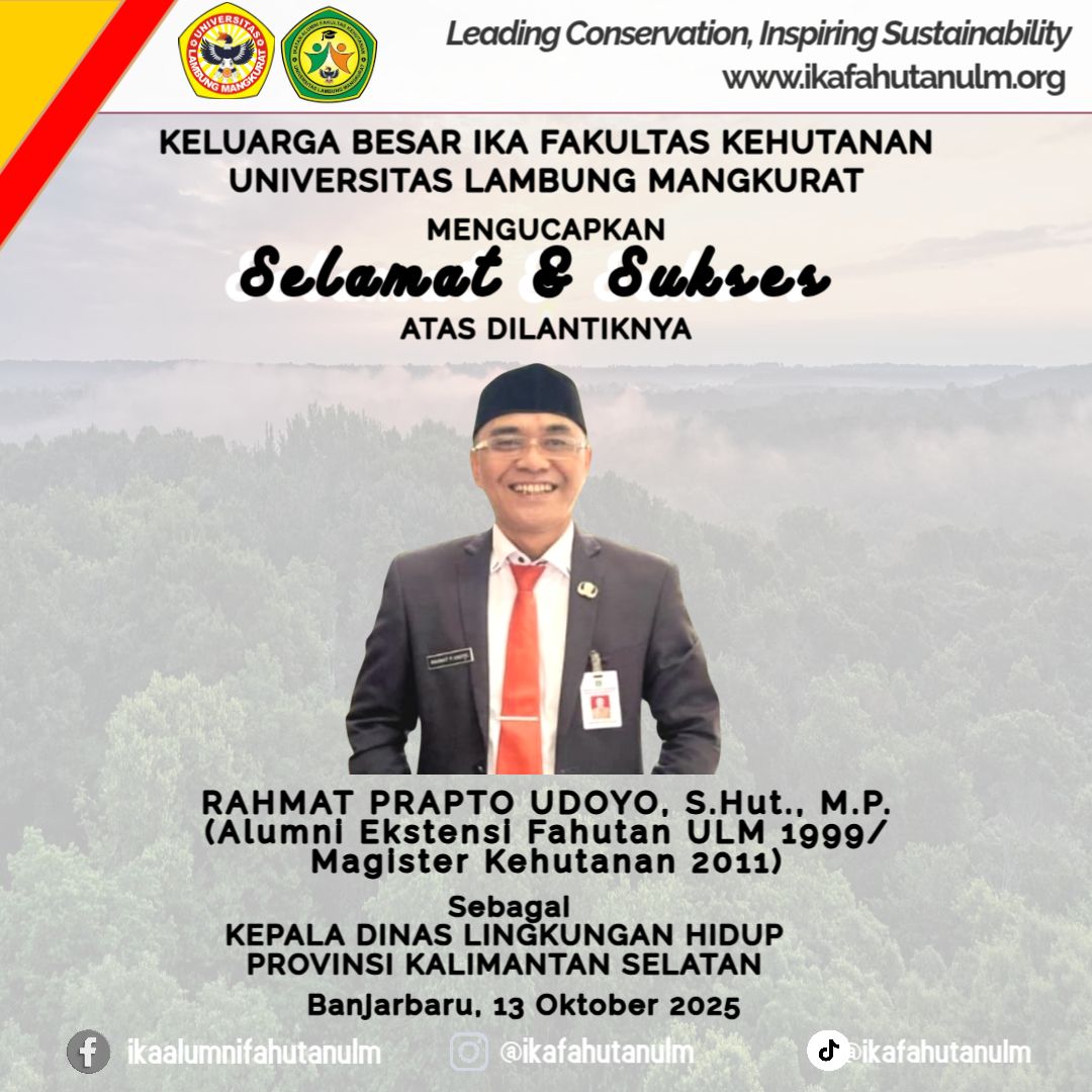 Banjarbaru, 13 Oktober 2025 – Keluarga besar Ikatan Alumni Fakultas Kehutanan Universitas Lambung Mangkurat (IKA Fahutan ULM) turut berbangga atas pelantikan Rahmat Prapto Udoyo, S.Hut., M.P. sebagai Kepala Dinas Lingkungan Hidup Provinsi Kalimantan Selatan.