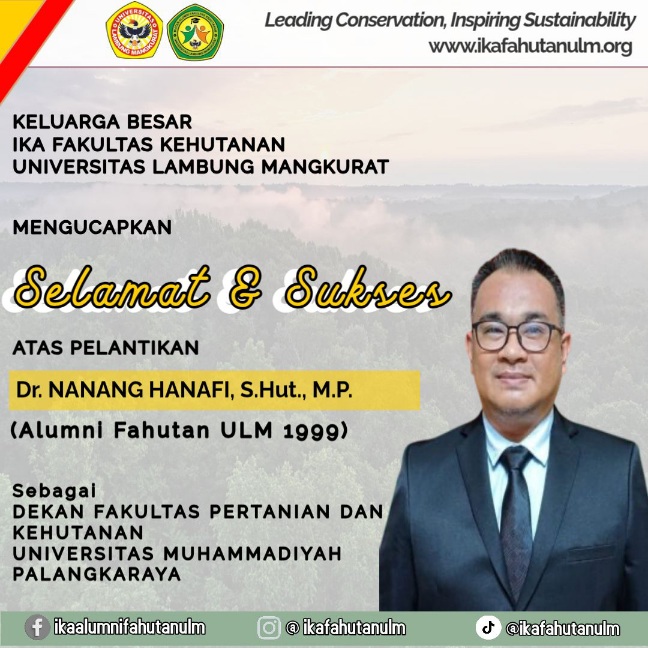 Keluarga Besar Ikatan Alumni Fakultas Kehutanan Universitas Lambung Mangkurat (IKA Fahutan ULM) menyampaikan ucapan selamat dan sukses atas pelantikan Dr. Nanang Hanafi, S.Hut., M.P. sebagai Dekan Fakultas Pertanian dan Kehutanan Universitas Muhammadiyah Palangkaraya (UMPR).