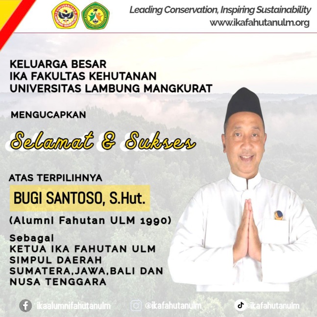 Keluarga Besar Ikatan Alumni (IKA) Fakultas Kehutanan Universitas Lambung Mangkurat (ULM) menyampaikan ucapan selamat dan sukses atas terpilihnya Bugi Santoso, S.Hut., sebagai Ketua IKA Fahutan ULM Simpul Daerah Sumatera, Jawa, Bali, dan Nusa Tenggara.