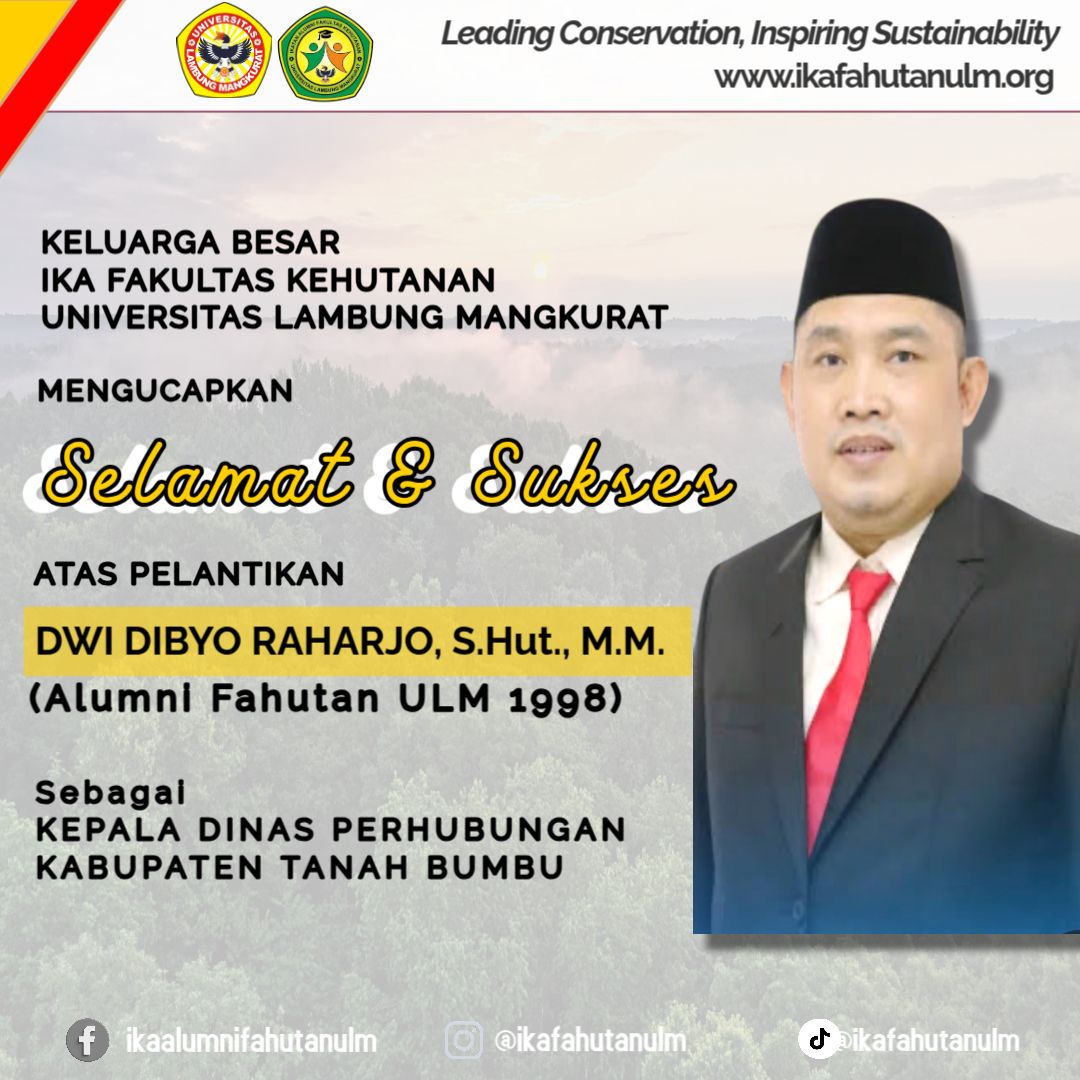 Keluarga besar Ikatan Alumni (IKA) Fakultas Kehutanan Universitas Lambung Mangkurat (ULM) menyampaikan ucapan selamat dan sukses kepada Dwi Dibyo Raharjo, S.Hut., M.M. (Alumni Fahutan ULM Angkatan 1998) atas pelantikannya sebagai Kepala Dinas Perhubungan Kabupaten Tanah Bumbu.