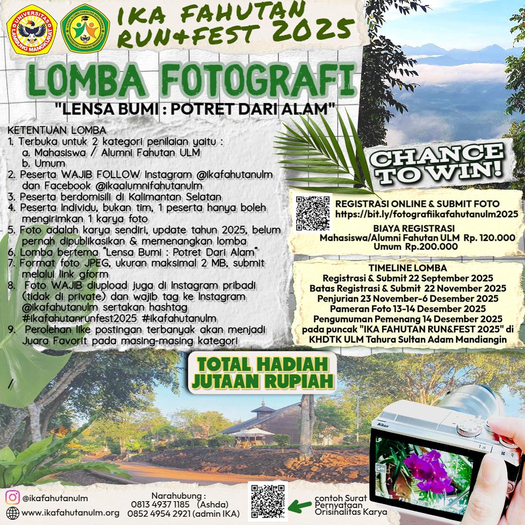 Dalam rangkaian IKA Fahutan Run & Fest 2025, Ikatan Alumni Fakultas Kehutanan Universitas Lambung Mangkurat (IKA Fahutan ULM) kembali menghadirkan sebuah ajang kreativitas yang mengangkat keindahan alam. Kegiatan ini dikemas dalam Lomba Fotografi bertajuk “Lensa Bumi: Potret dari Alam”, terbuka untuk mahasiswa, alumni, maupun masyarakat umum.