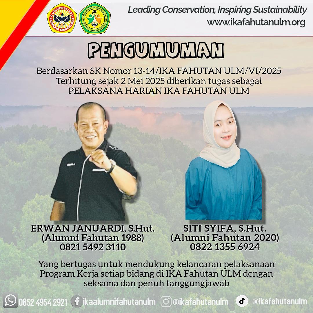 Penetapan tersebut berdasarkan Surat Keputusan Nomor 13-14/IKA FAHUTAN ULM/VI/2025, yang mulai berlaku sejak tanggal 2 Mei 2025.